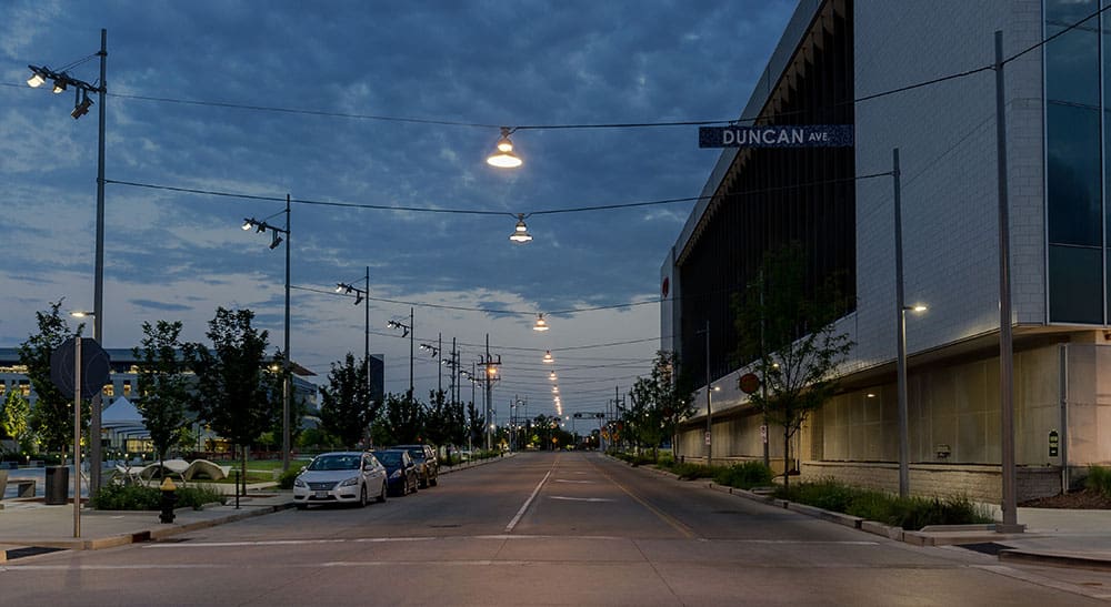 Located in the midtown sector of St. Louis, the Cortex Innovation Community has rapidly grown into a nexus for biotech companies and those that support them. Situated adjacent to one of the country’s largest hospital complexes, the research neighborhood has served as principal catalyst for the area’s urban renaissance including residential, street side retail, restaurants, and other service focused development. With immediate proximity to both mass transit and bicycle-centric connections, the energetic area is set for even greater growth. Collaborating with SWT Design, Randy Burkett Lighting Design played an important role, developing a design that serves the desired visual vocabulary for the central core of the development, both day and night.