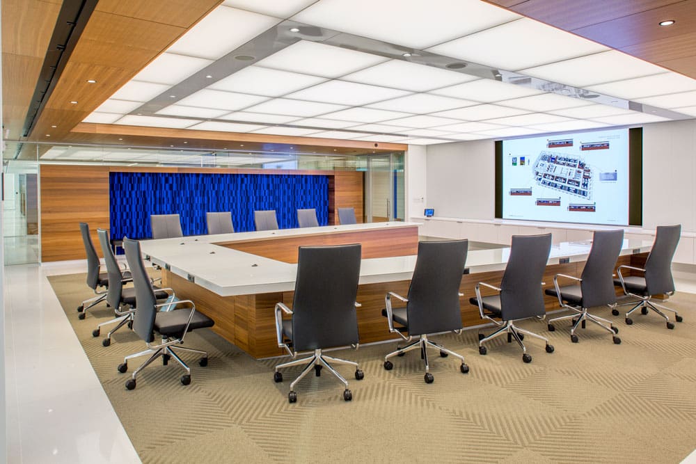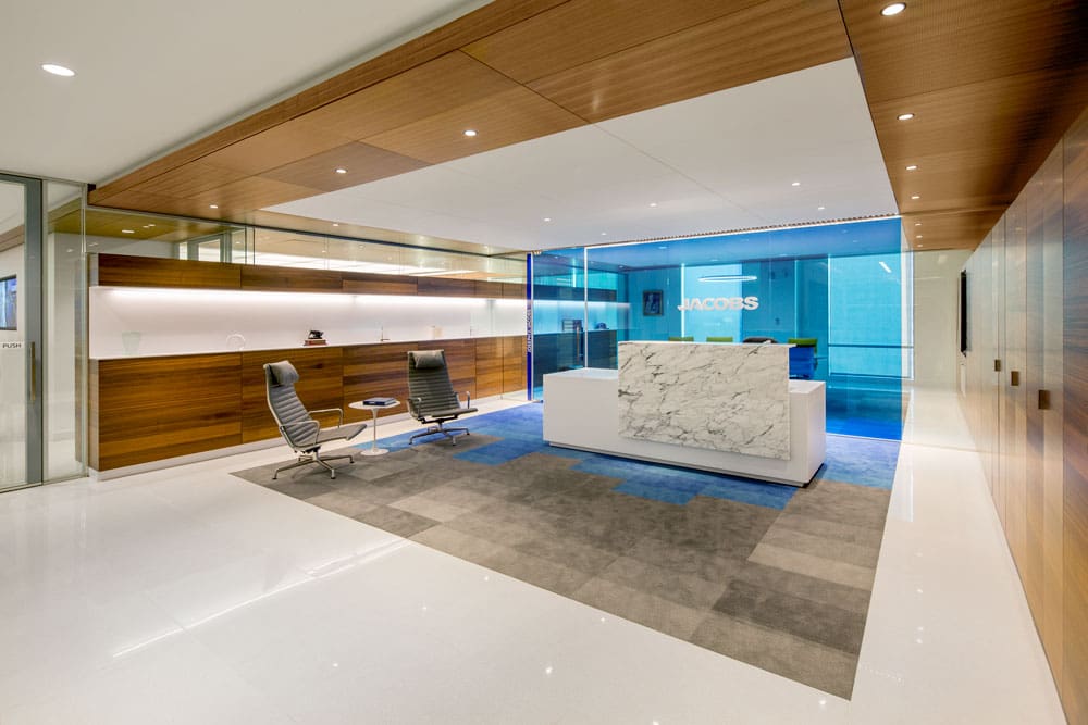 Jacobs, a large, multi-national design, engineering, and construction firm, was relocating its corporate headquarters. After extensive searches, Dallas offered the accessibility to top talent and greater client convenience that Jacobs preferred. The design was key to the relocation. To combat perceptions that Jacobs was primarily an engineering firm, a progressive space was desired. Jacobs’ in-house architects and designers were tasked with creating a hip environment to aid marketing and recruitment efforts. Lighting’s challenge was to create a visual identity supporting this message while exhibiting sustainable practices on a modest budget.