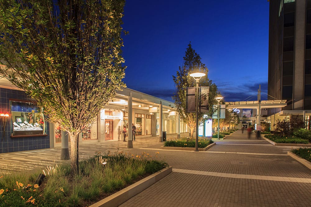 Oakbrook Center has been a cornerstone of its Illinois community since it opened in the early 1960’s. Owned by General Growth Properties, it is one of the largest shopping centers in the Chicago area and has drawn accolades over the years for its charming setting, sophisticated store mix, and a focus on community engagement. The Center needed to update its look, while maintaining its signature feel and timeless style. The renovation’s goal was to further enrich Oakbrook’s already elegant character by creating an atmosphere even more inviting and approachable. This was accomplished through a successful, collaborative design bringing together architecture, landscape architecture, and lighting design to create a new nighttime identity for the Center while maintaining the hallmark attraction of the original design. Led by Omniplan, the design team included Studio Outside and Randy Burkett Lighting Design.
